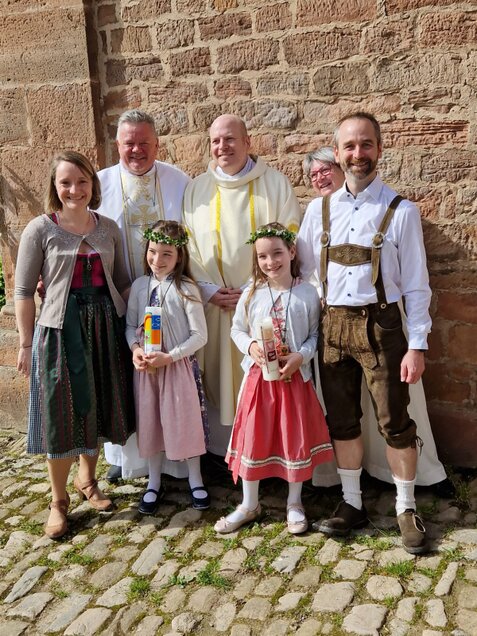 Zum ersten Mal am Liebesmahl nahmen Amelie und Svenja teil. Die beiden Mädchen haben sich lange auf diesen Tag vorbereitet. Bereits die Taufe spendete ihnen 9 Jahre zuvor der damalige Diakon P. Dietholf Maria. Auch auf den großen Tag bereitet er sie nun vor.